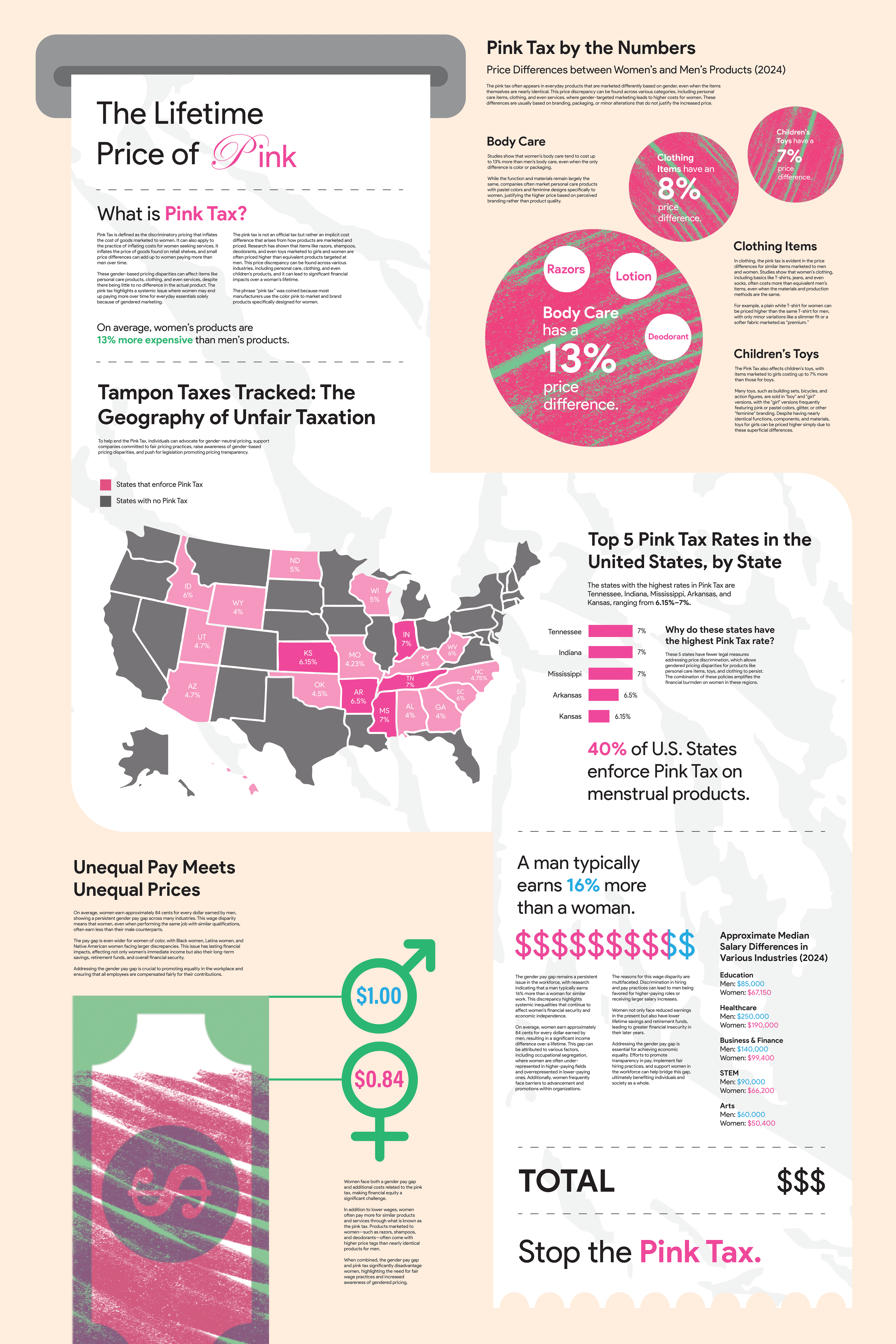 highlighting the impact of the pink tax. The design incorporates structured organization and dynamic elements to effectively communicate key statistics and insights.